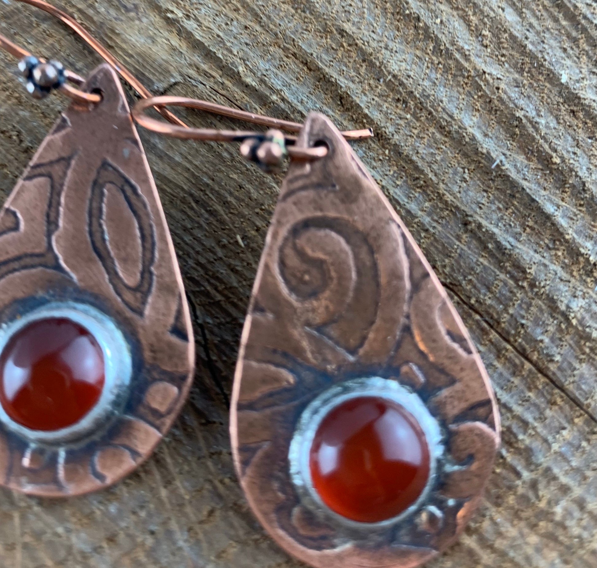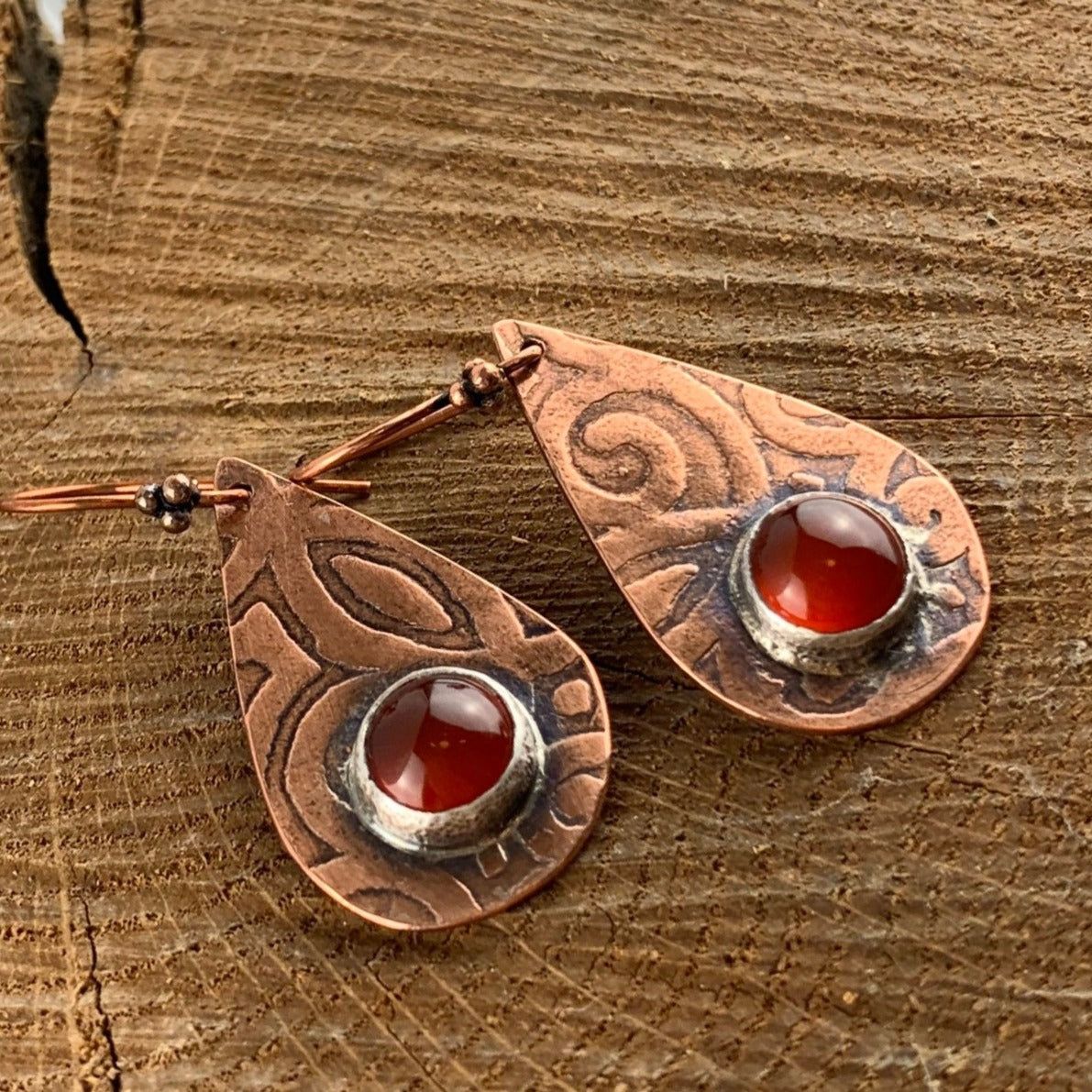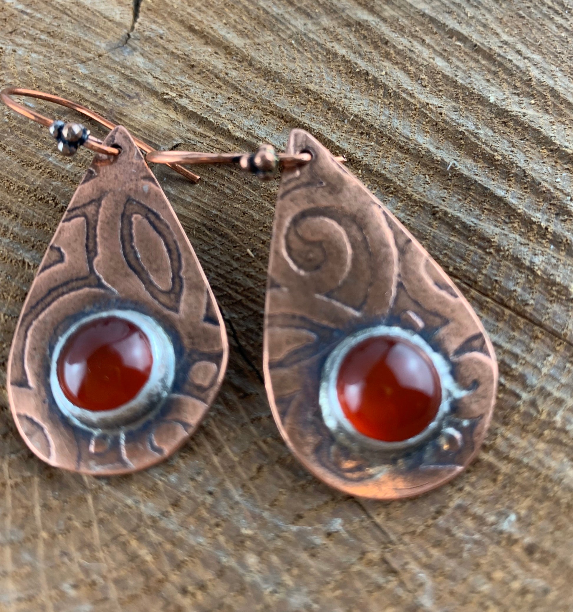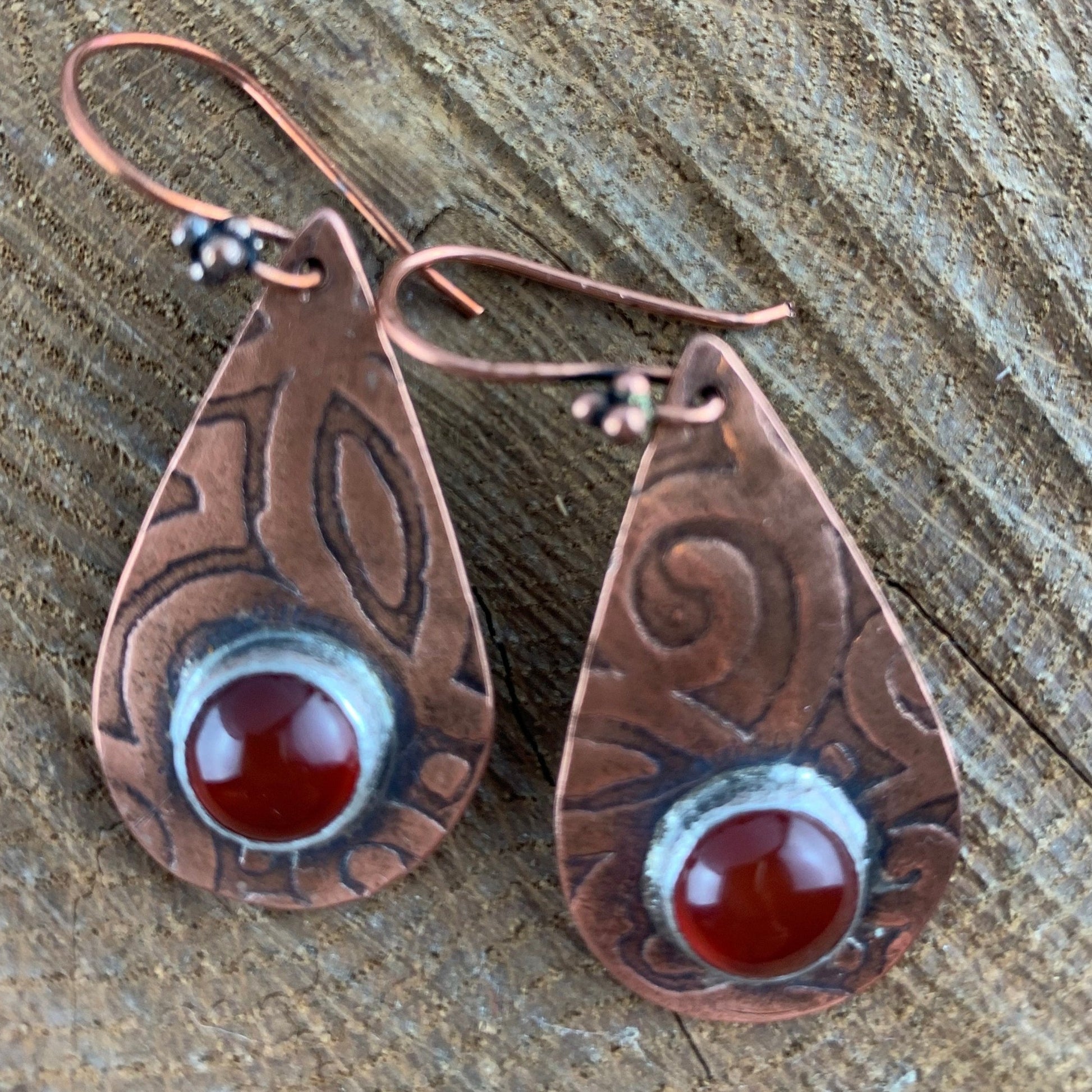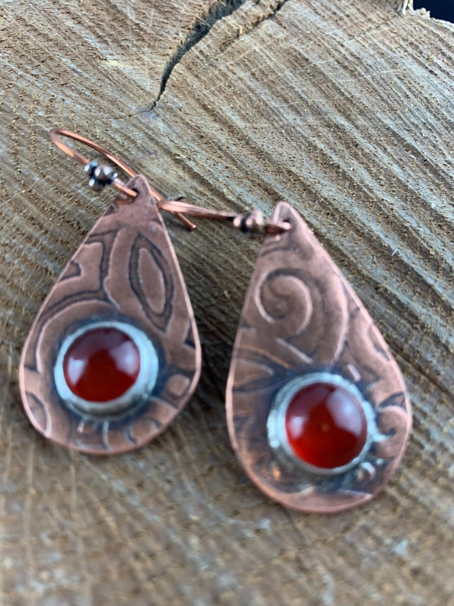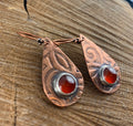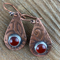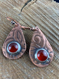 Antiqued and etched copper teardrop dangle earrings with a carnelian gemstone setting on French earwire.