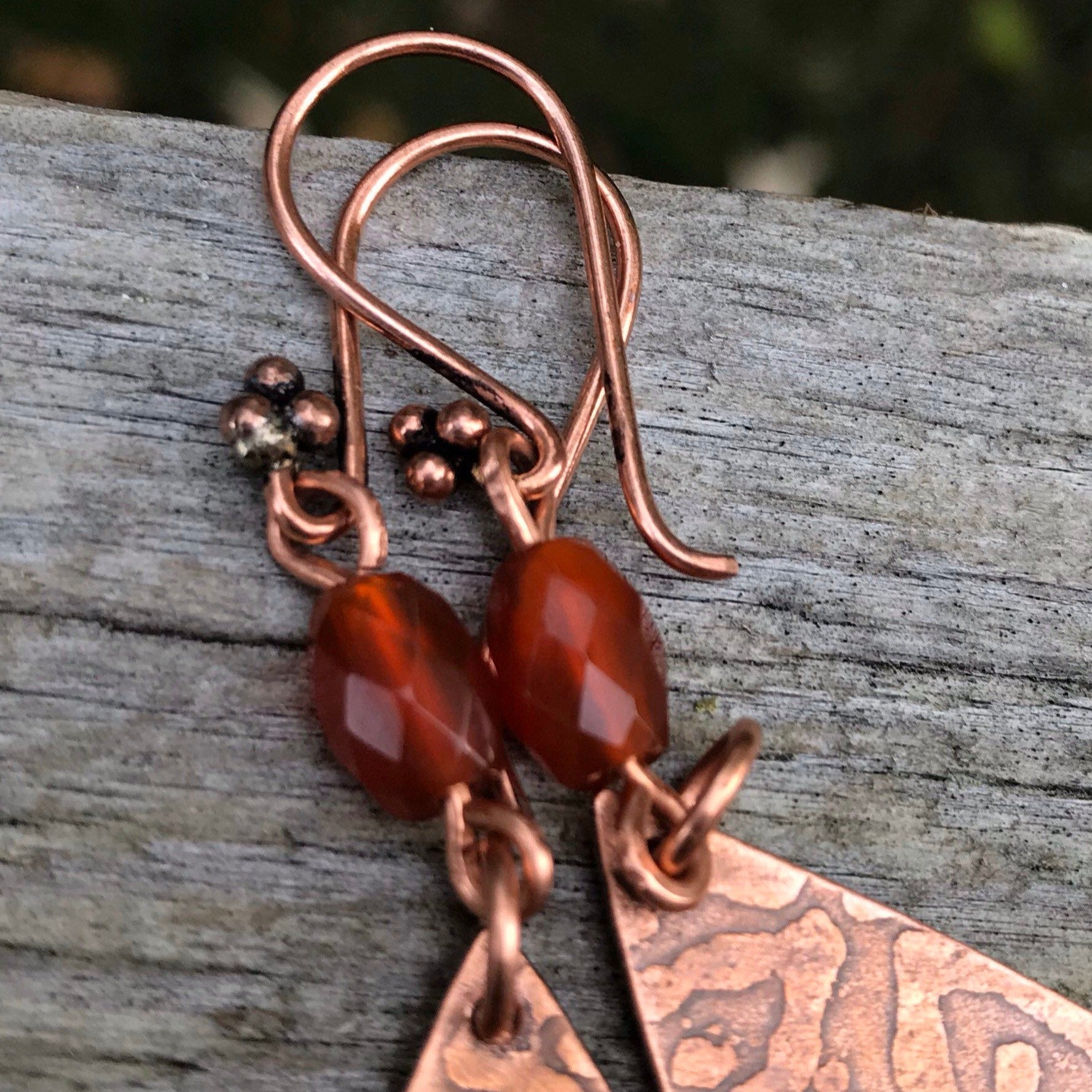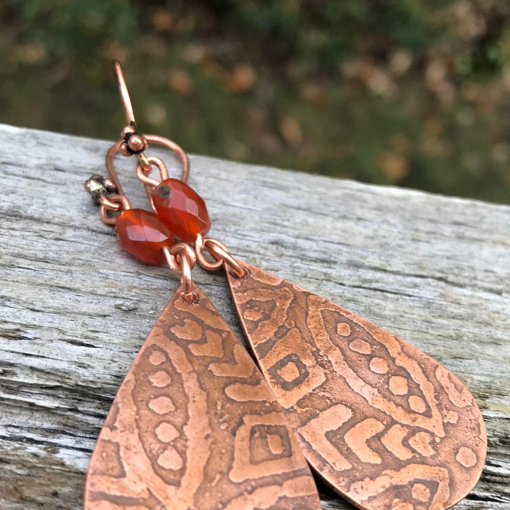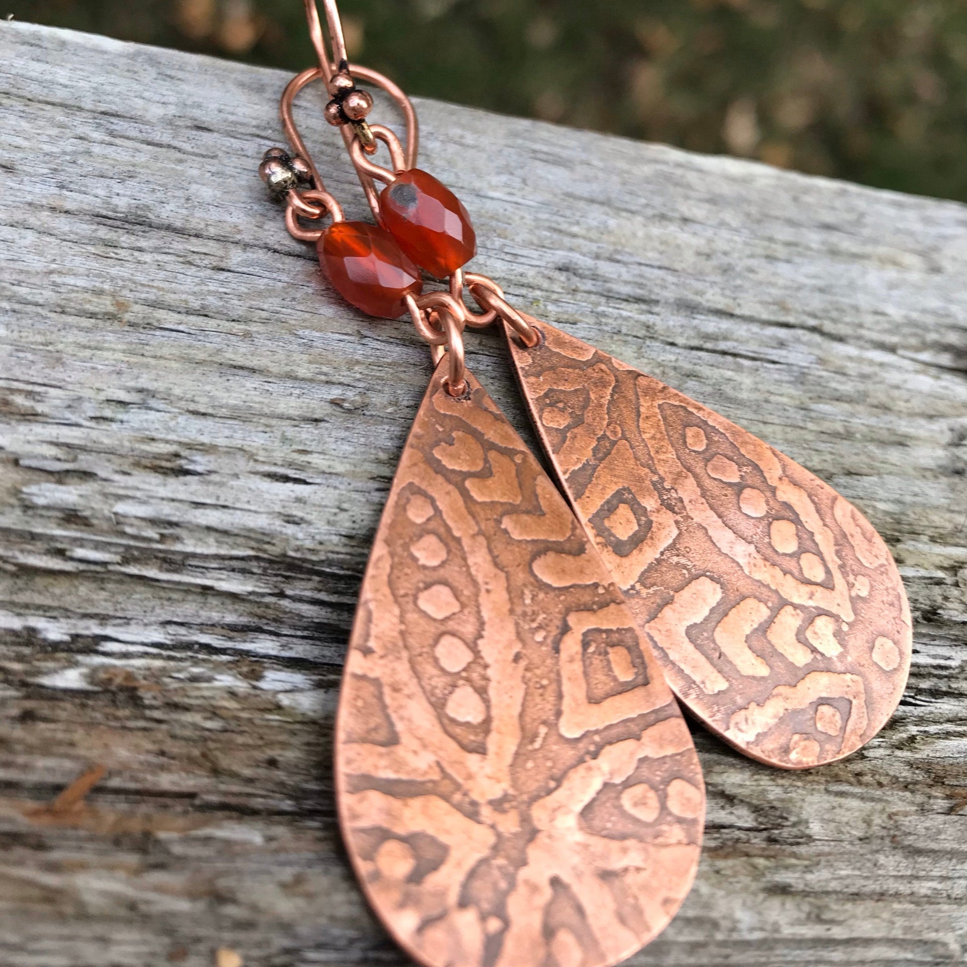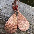 Artisan Etched Copper Teardrop Earrings, and Carnelian