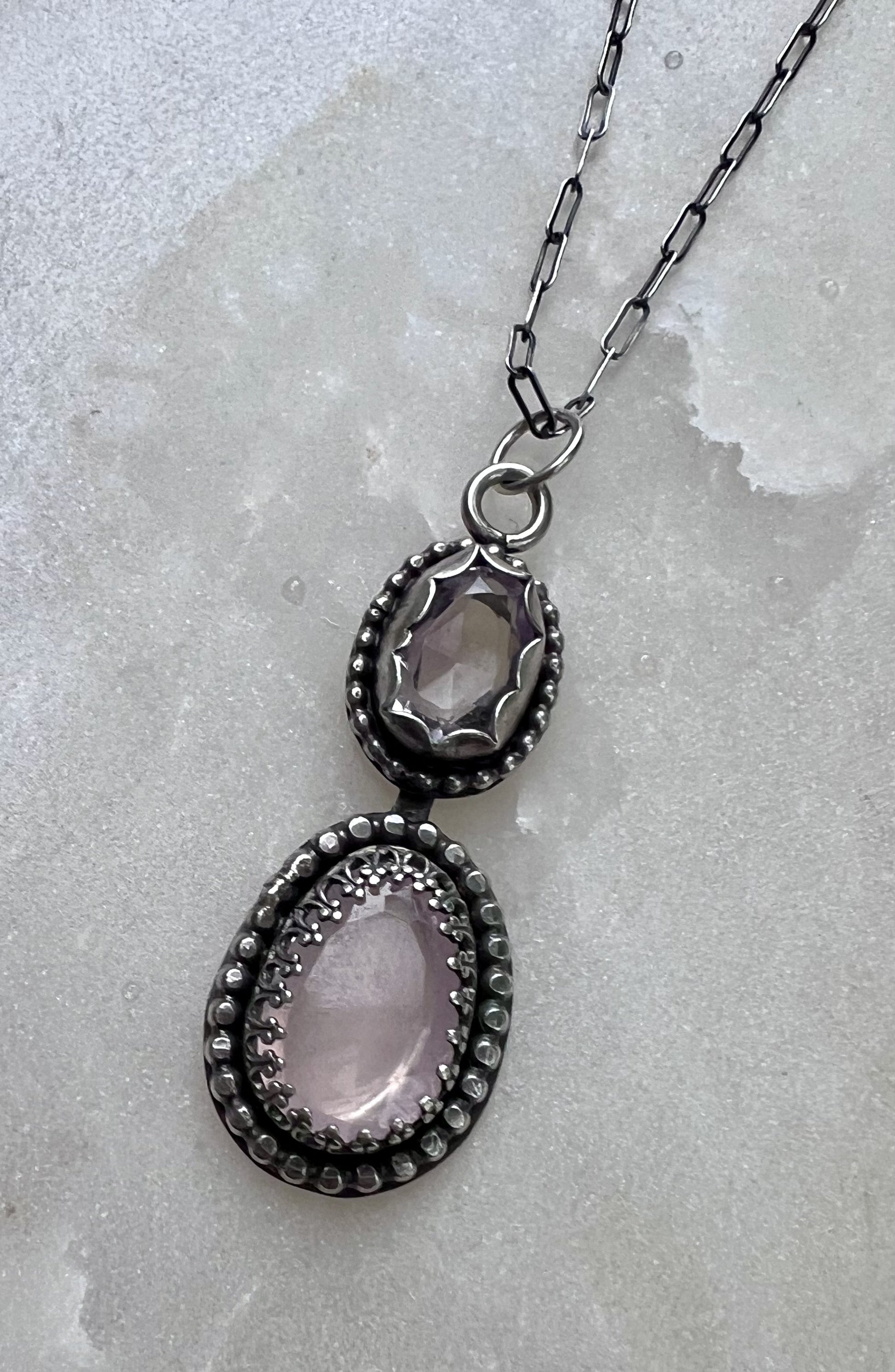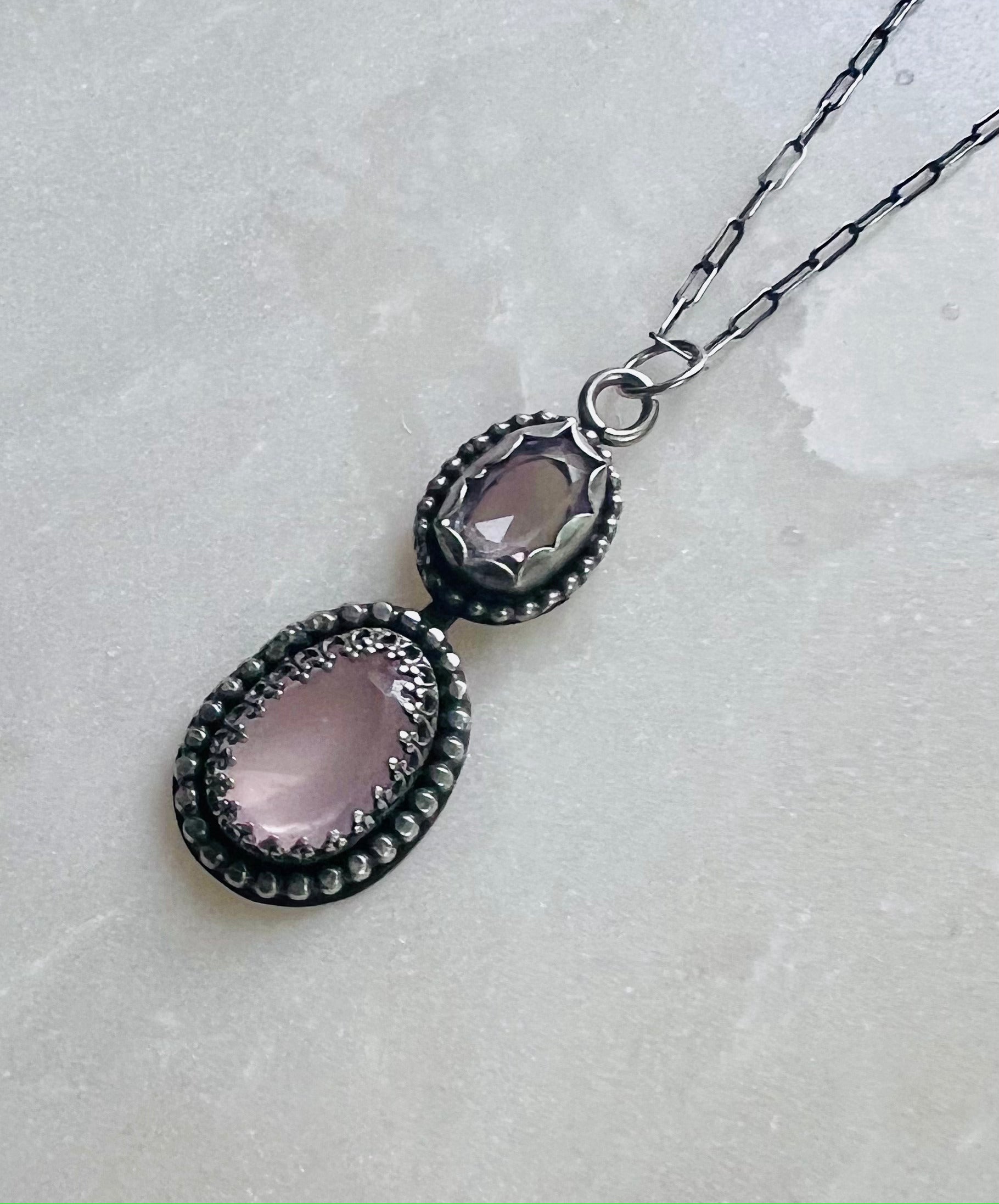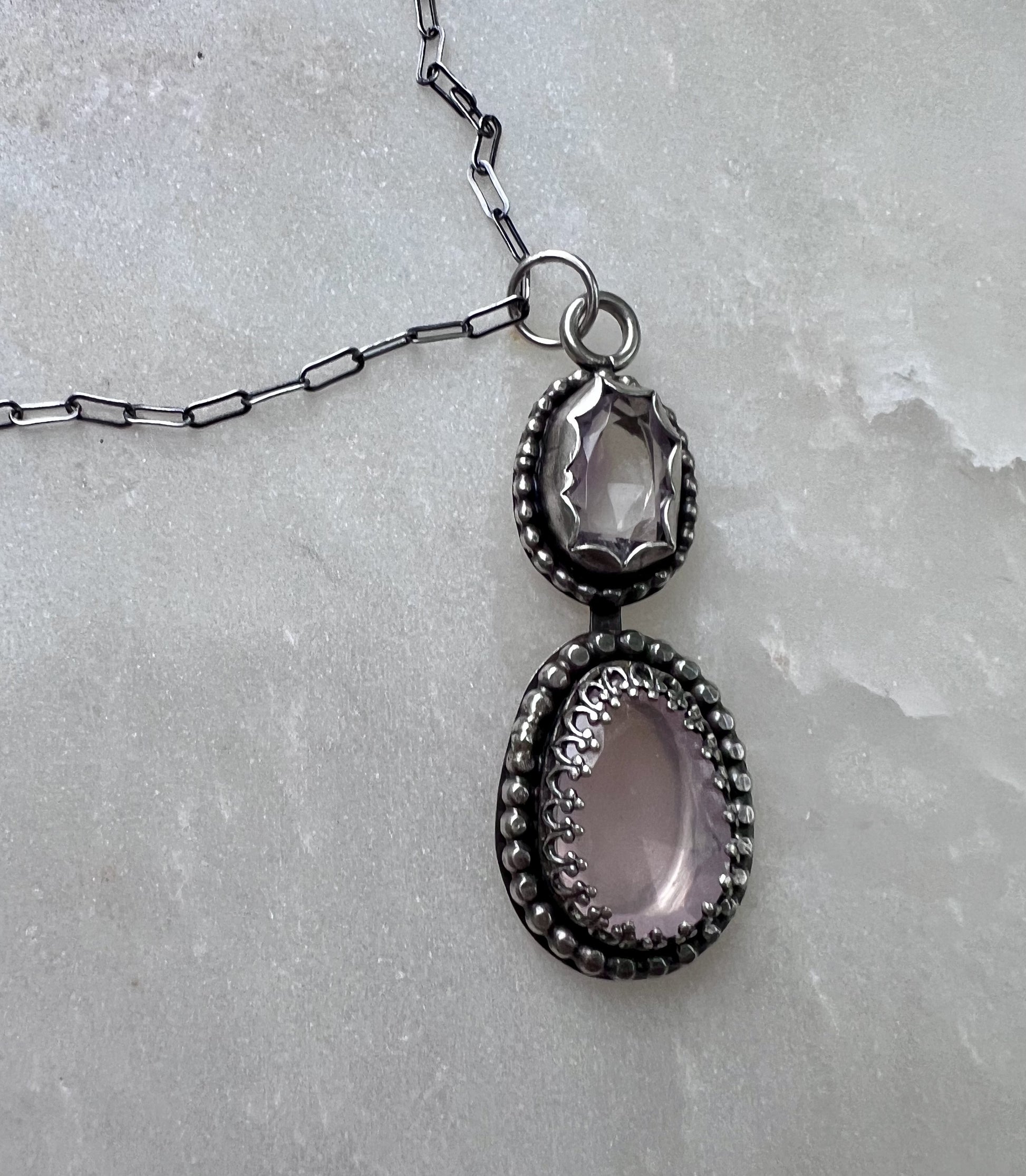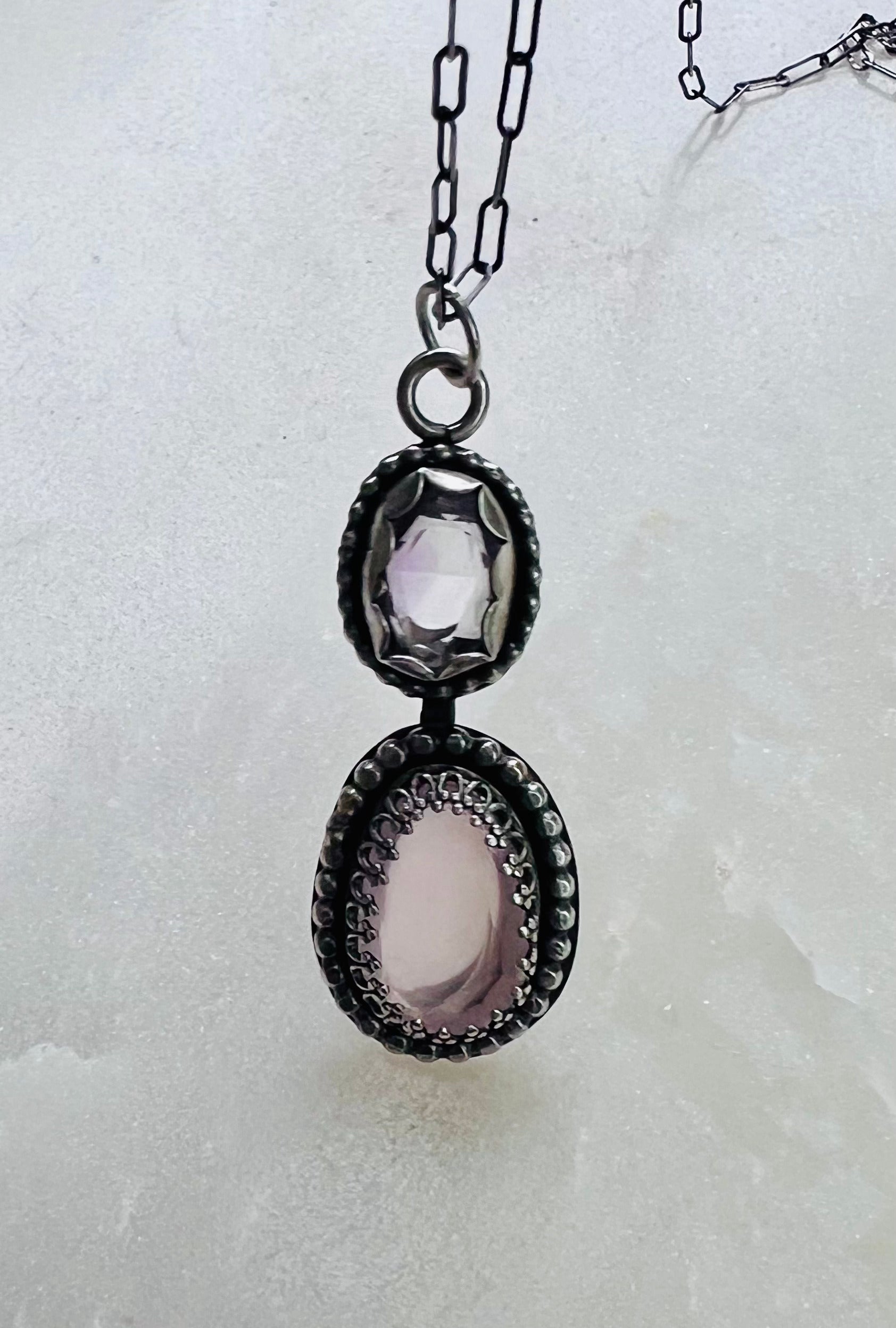 Elevate your style with this enchanting Dual Amethyst and Rose Quartz Pendant Necklace. This exquisite piece features two beautifully faceted gemstones: a deep purple amethyst and a soft pink rose quartz, each set in intricate sterling silver bezels adorned with delicate beadwork. Suspended from a fine sterling silver chain, this pendant necklace is a timeless addition to any jewelry collection, ideal for both casual and formal wear.