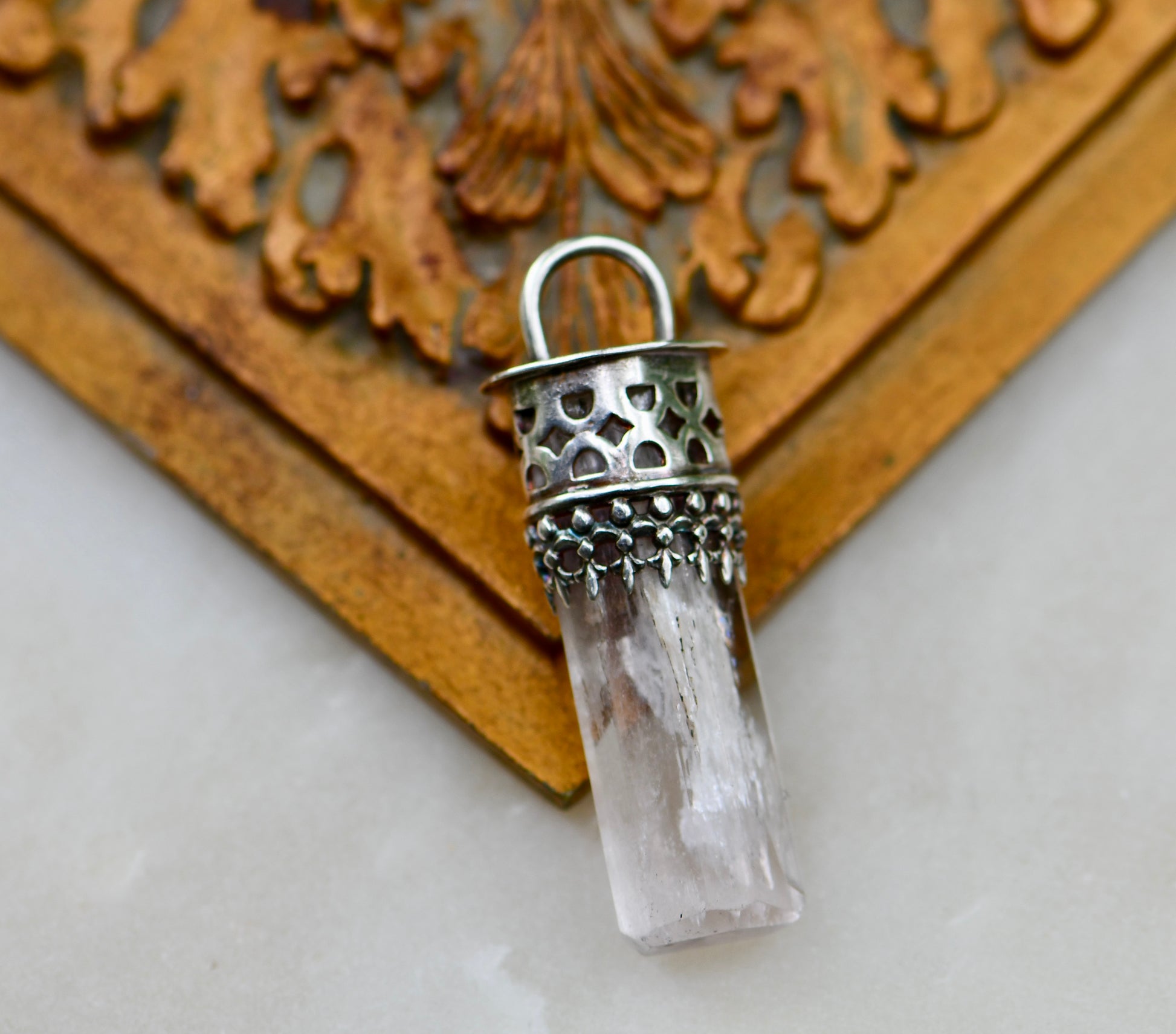 Adorn yourself with the timeless beauty of our Elegant Sterling Silver Amethyst Point Pendant. This exquisite piece features a naturally polished amethyst crystal point encased in intricate sterling silver. The ornate silver setting highlights the crystal's natural beauty and adds a touch of vintage allure. This pendant embodies sophistication and natural charm. The pendant measures approximately 2" L x .56" wide and comes with a durable sterling silver bail, ready to be paired with your favorite chain.