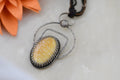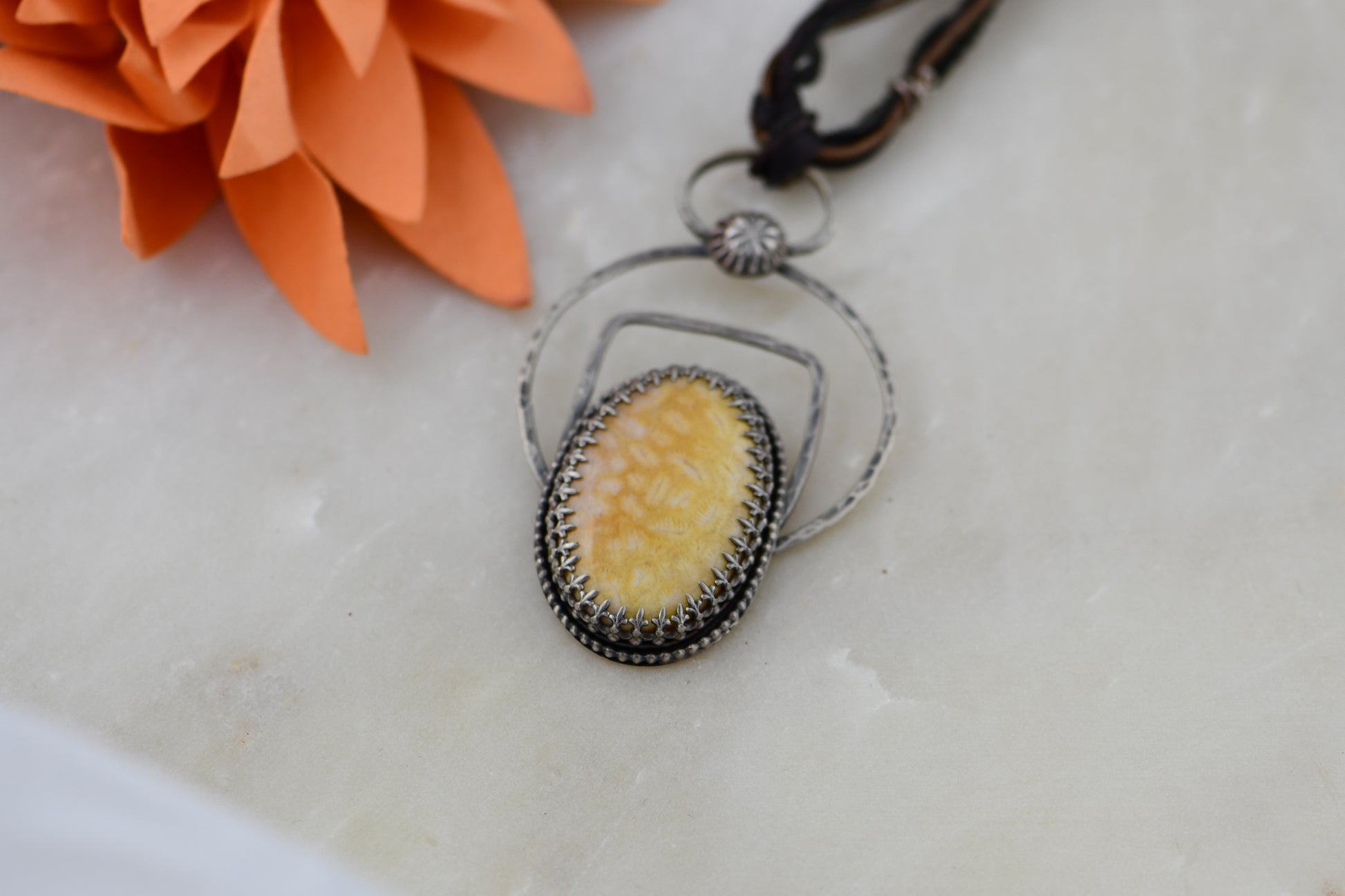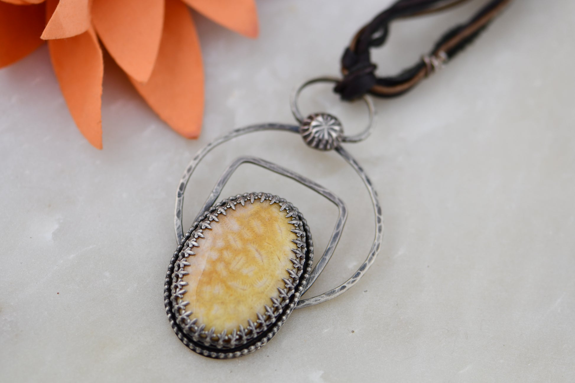 Make a statement with this exquisite handcrafted Fossil Coral stone pendant, featuring an intricate halo-effect design in the sterling silver frame. The unique fossil coral stone showcases natural patterns and is set in a beautifully detailed sterling silver frame, suspended from a durable leather cord.