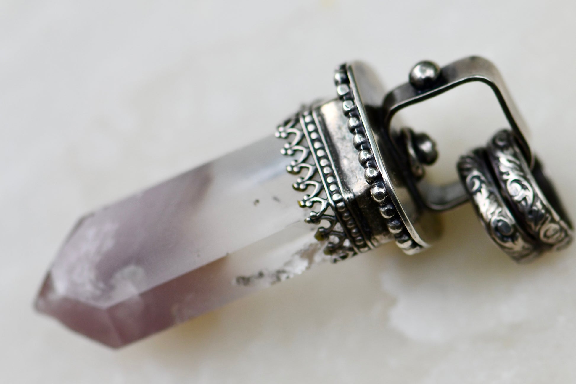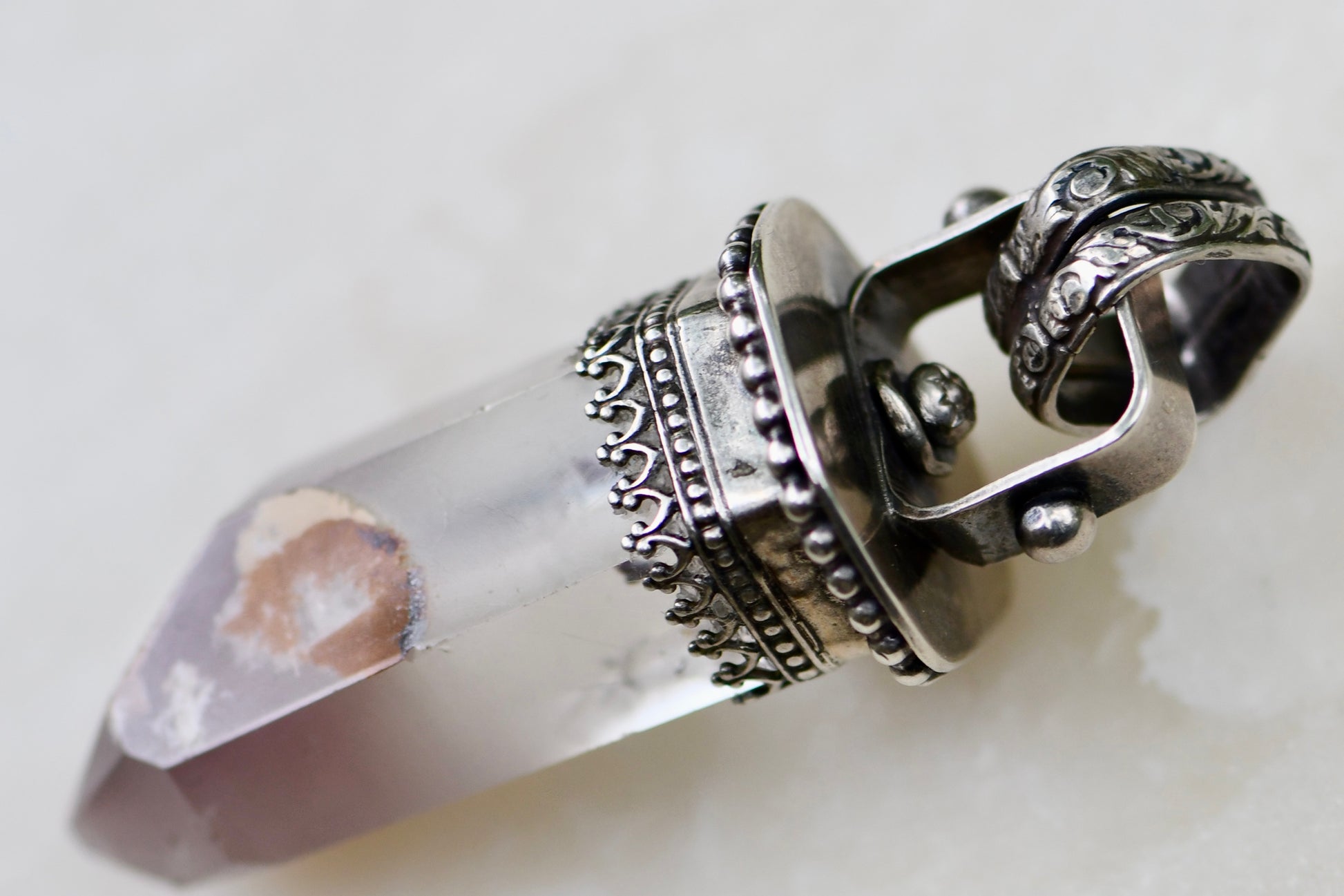 Large Crystal Point Pendant set in an Ornate Sterling Silver Setting