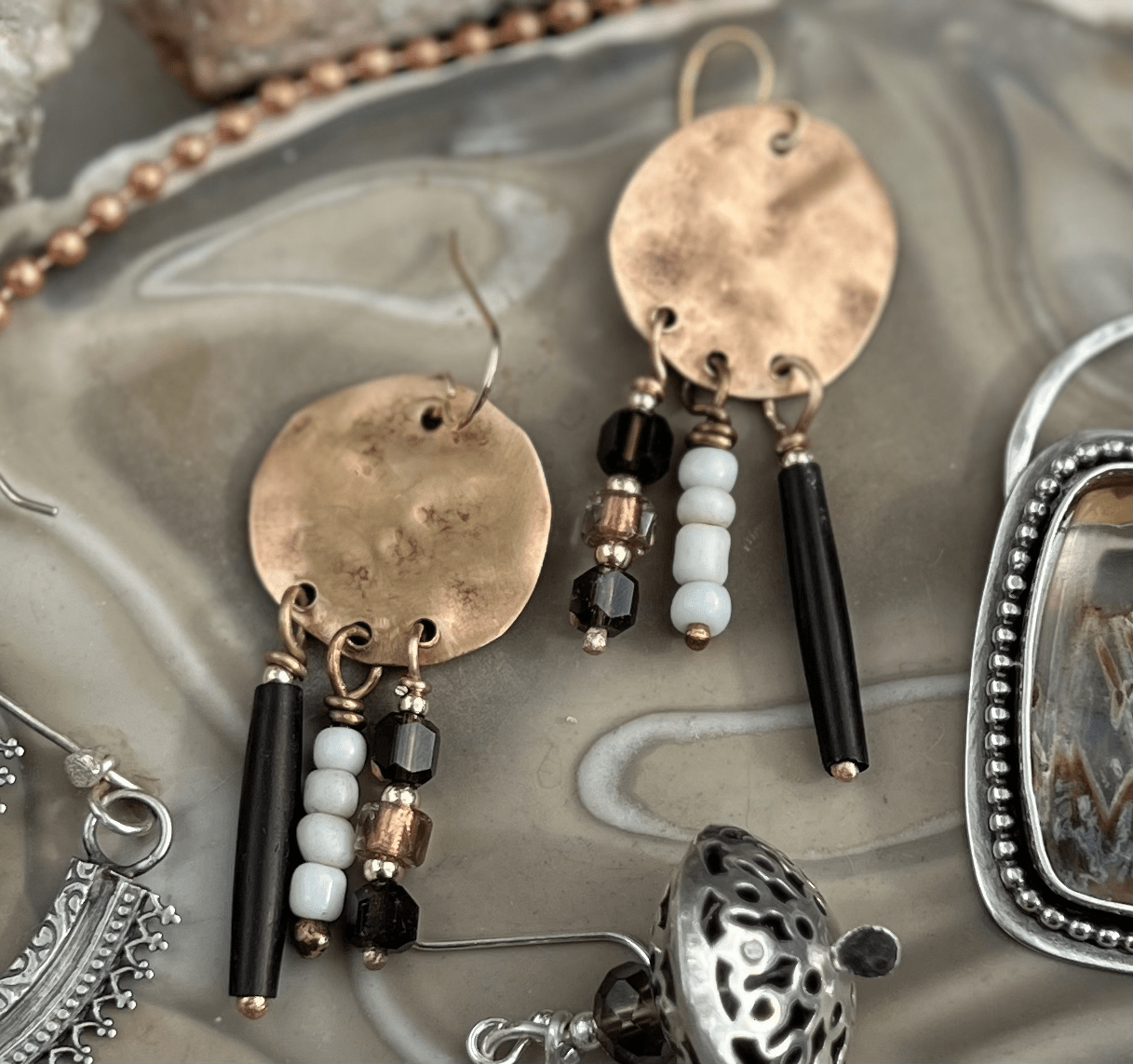 Add a touch of rustic elegance to your jewelry collection with our "Rustic Charm" hammered bronze beaded drop earrings. These unique earrings feature a hammered bronze design, enhanced by an array of colorful beads that dangle gracefully. Perfect for both casual and dressy occasions, they bring a blend of earthy sophistication and playful style to any outfit. Handcrafted with care, these earrings are a standout accessory with their distinctive design.