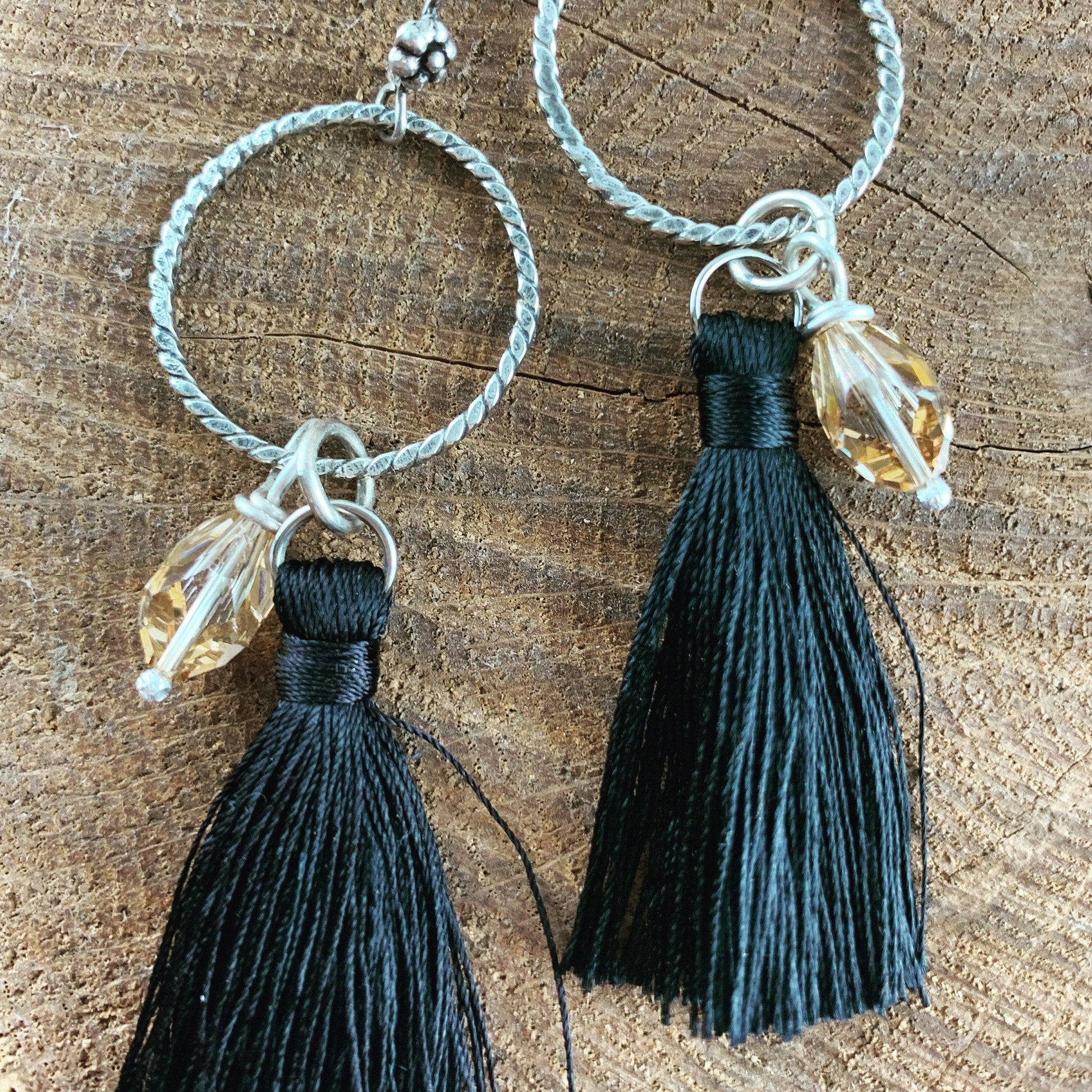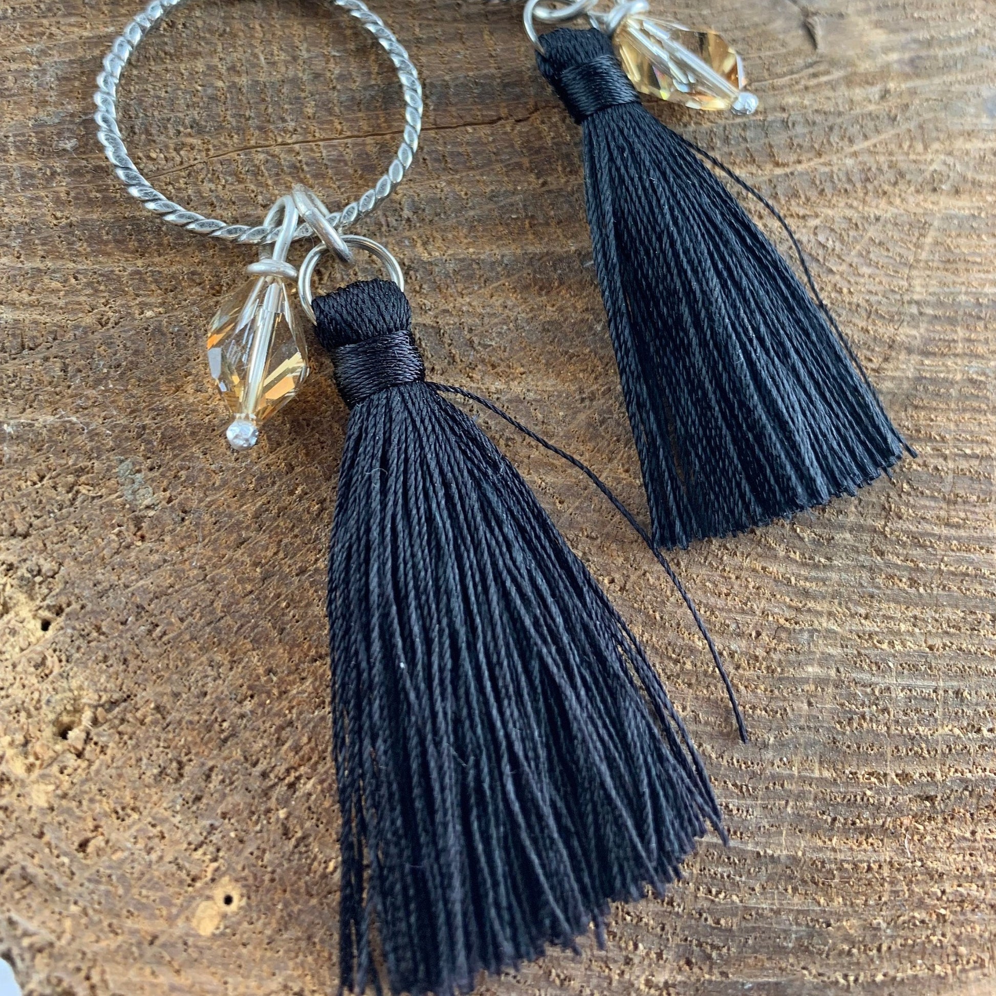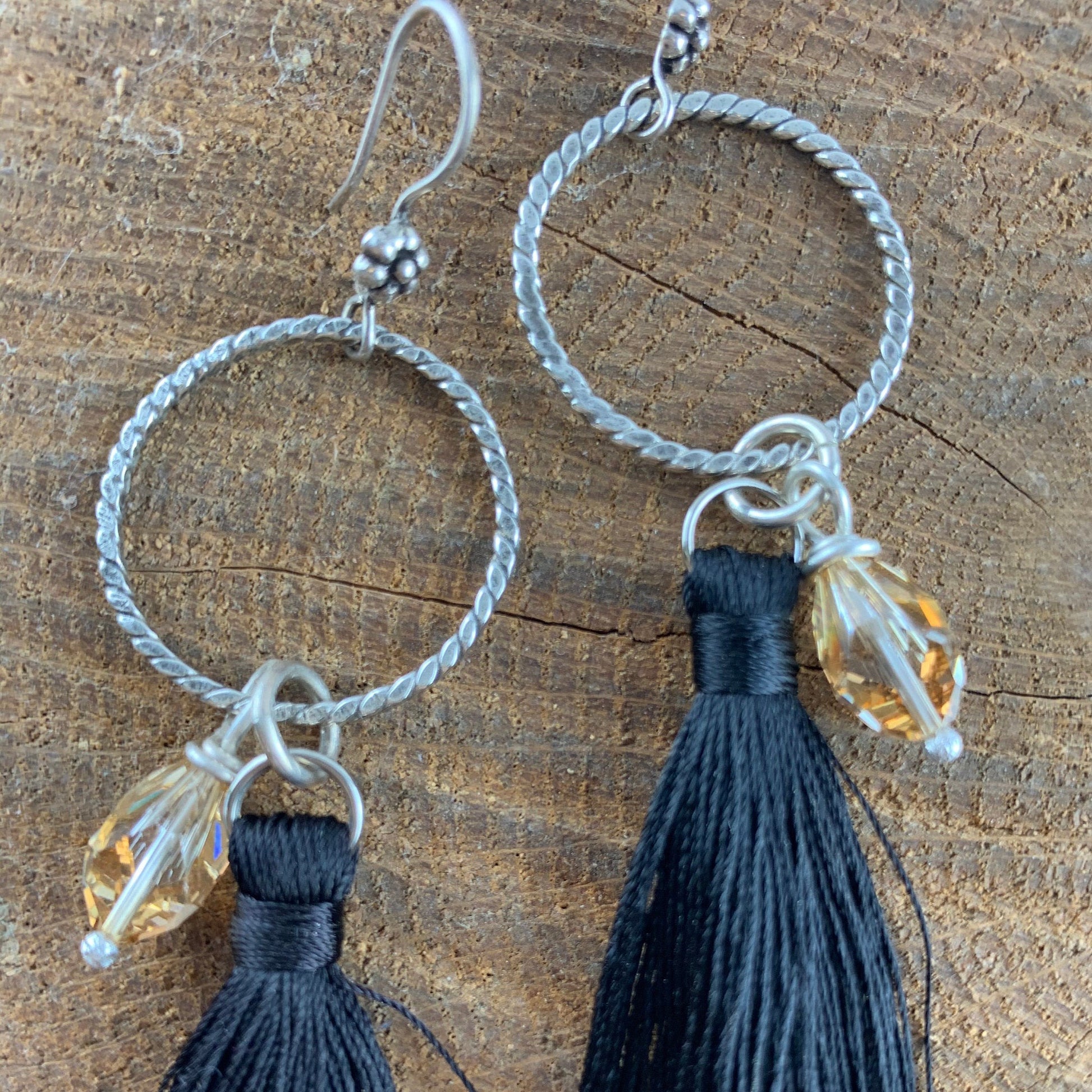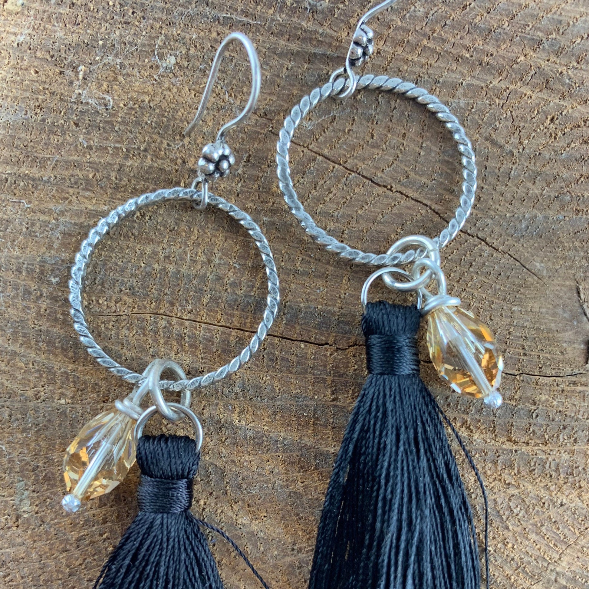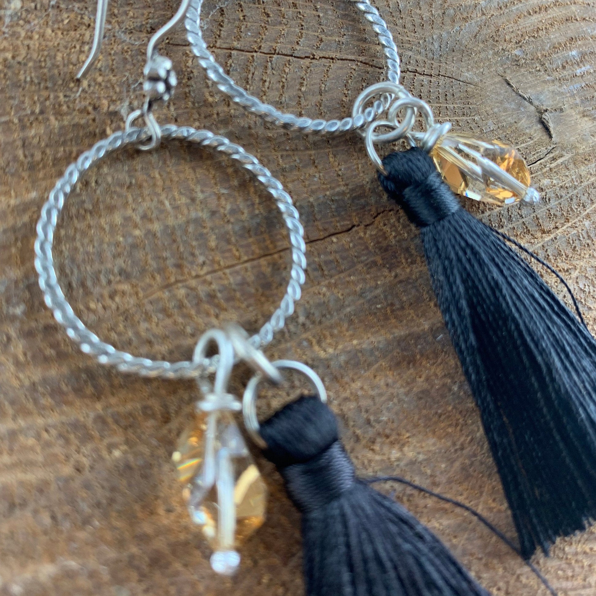 This is a pair of round rope hoop earrings accented with light Colorado topaz teardrop Swarovski crystal beads and a black satin tassel on a French ear wire.