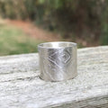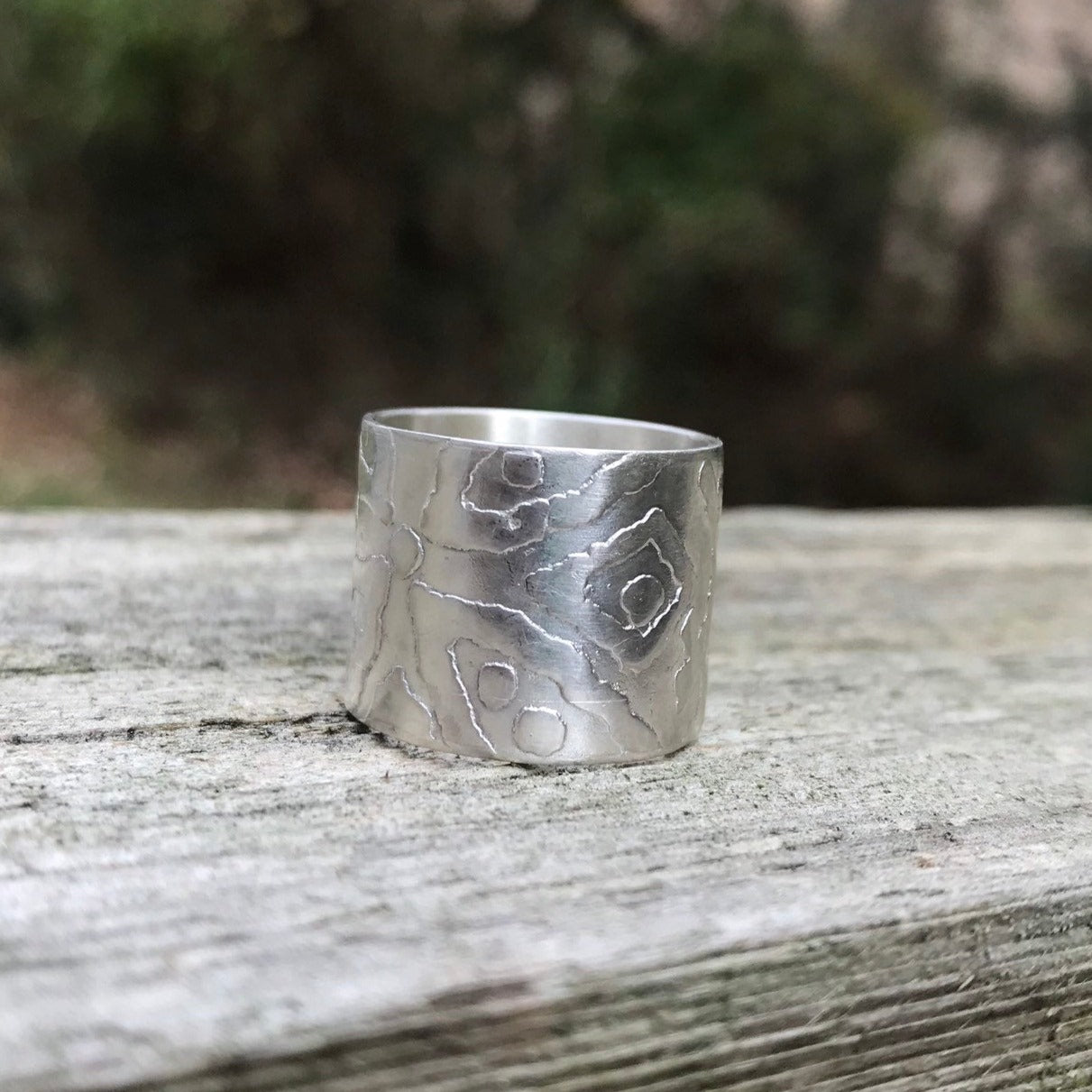 Introducing the unique Batik Band, a limited-edition sterling silver ring featuring a one-of-a-kind etched pattern. Crafted in sterling silver (18g thickness) and intricately designed for a beautiful and timeless look. Because the ring is so beautifully wide, please order a full size up than your regular ring size to accommodate the thickness and ensure easy breezy comfort all day. If you have questions on sizing, just let me know. Please allow 2-3 weeks for us to create your beautiful ring.