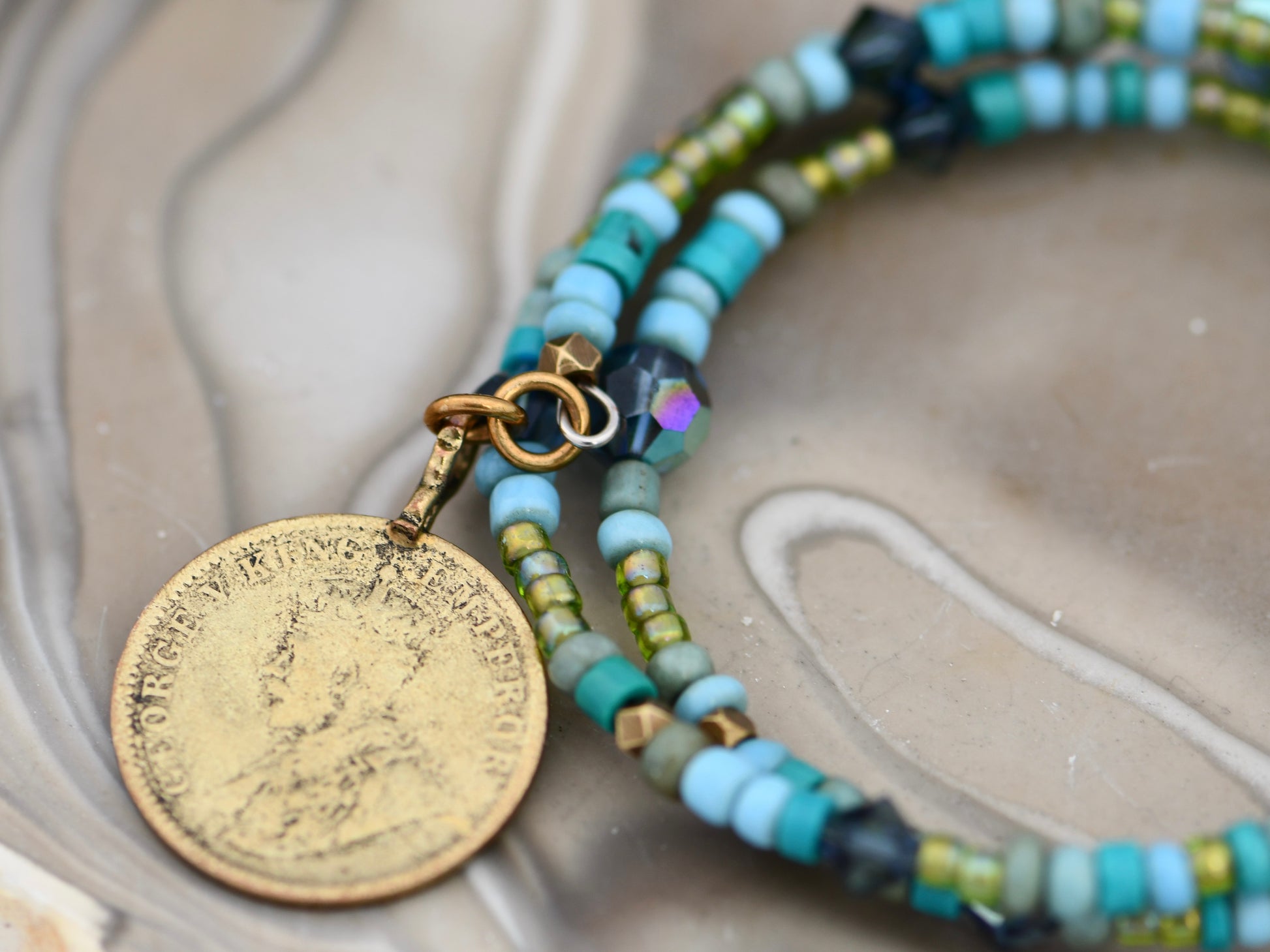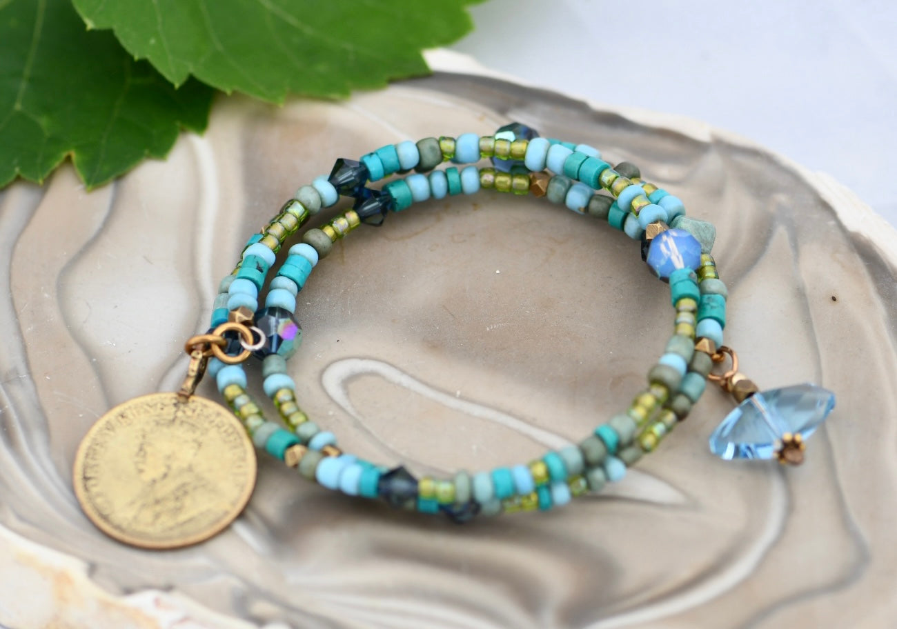 Elevate your style with our exquisite Turquoise Charm Wrap Bracelet. This unique piece features a blend of turquoise and green glass beads, creatively arranged to create a vibrant and elegant look. The bracelet is adorned with a vintage-inspired gold coin charm and a sparkling blue swarovski crystal, adding a touch of luxury and sophistication. This wrap-around design offers a comfortable fit and effortless chic.